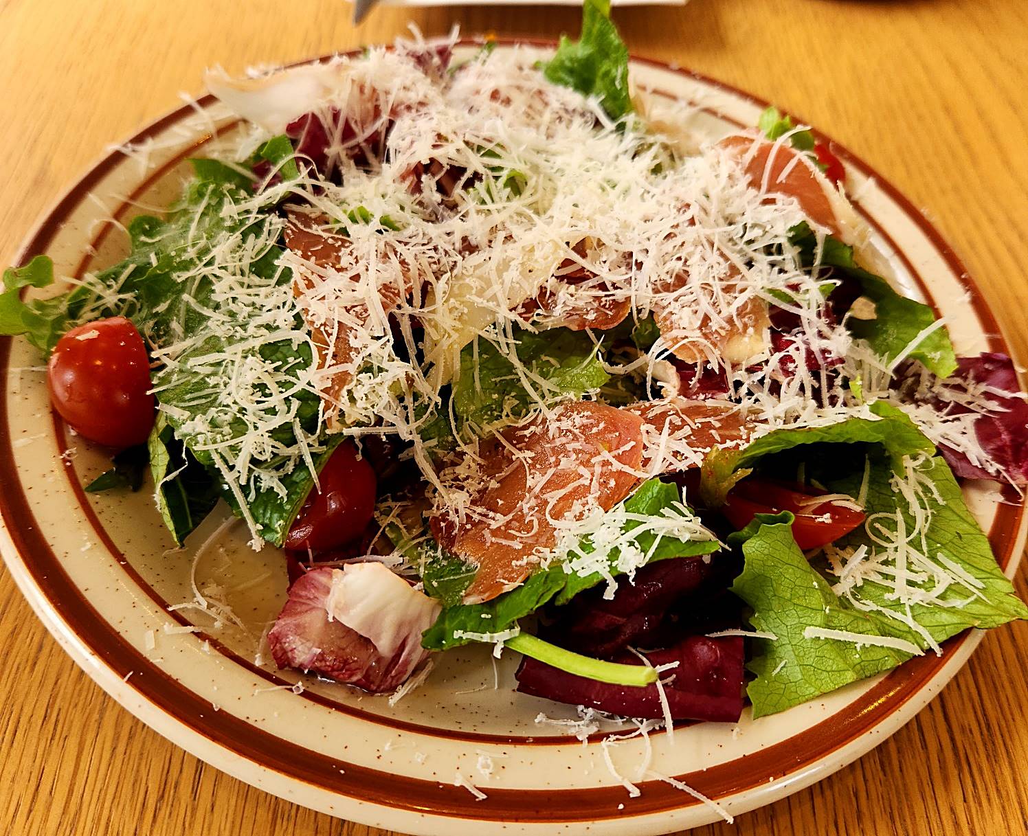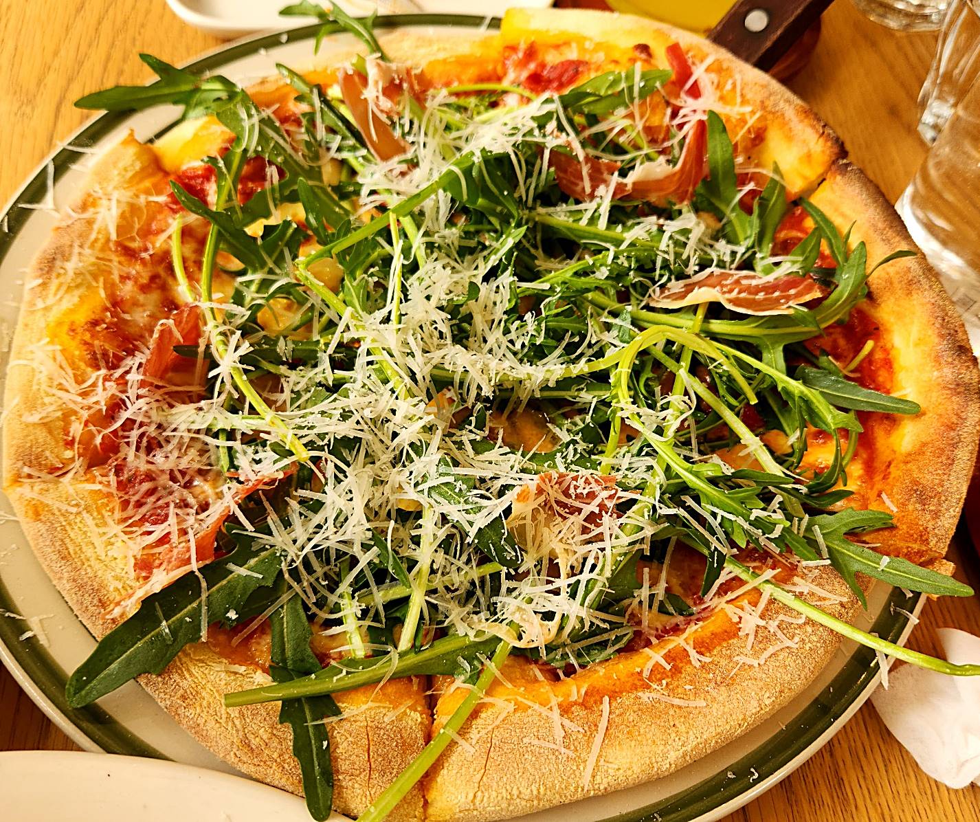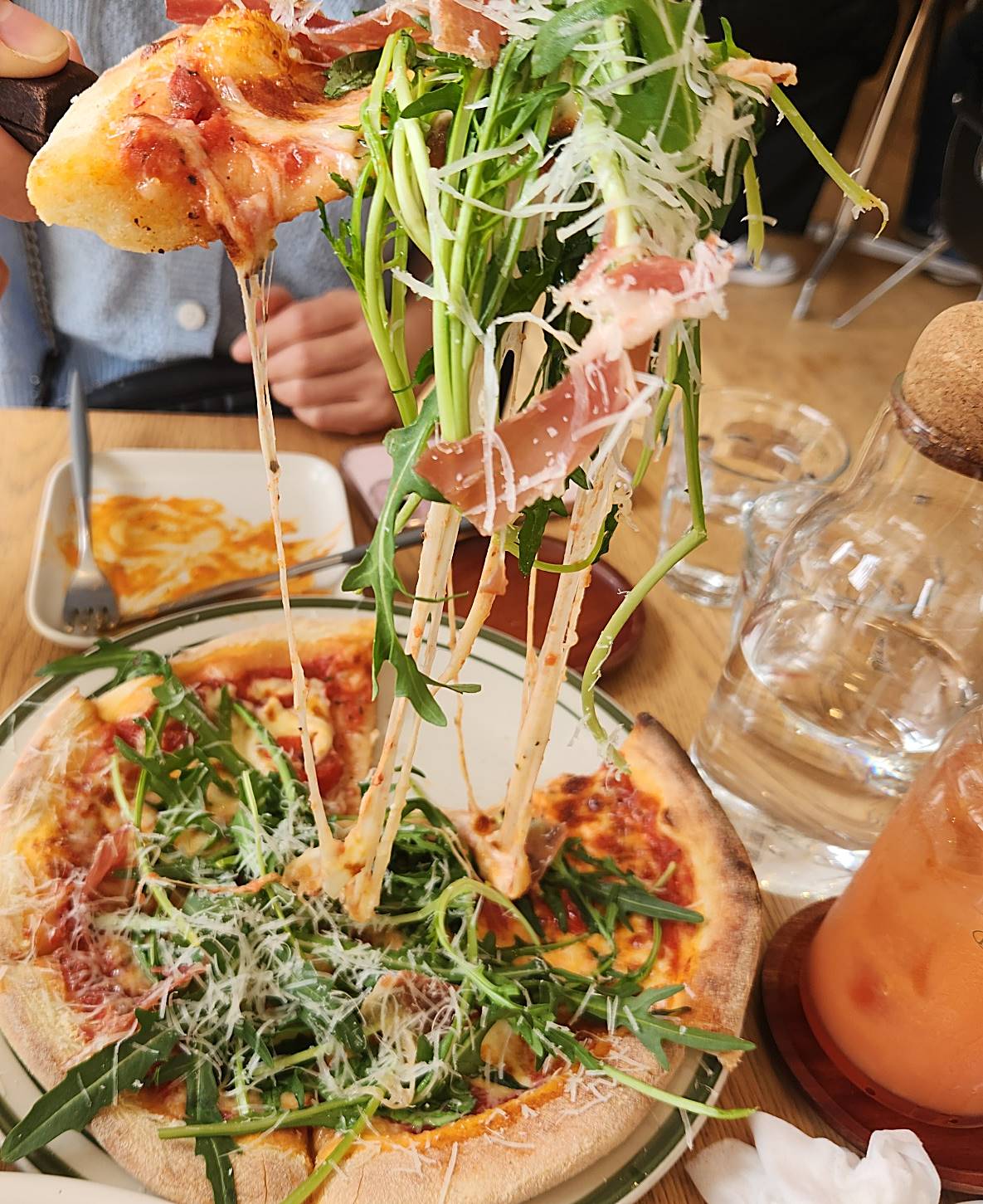 루꼴라가 피자 위에 올려져 있는 풀이고 프로슈토가 이태리 햄이란 걸 처음으로 알았던 날이었고 정말 먹음직스러운 비주얼이었다. 피자 위에 루꼴라가 얹어져 있는 느낌이어서 피자에 돌돌 말아 싸서 먹어야 될 거 같고 피자는 한 조각씩 너무 위로 들지 않는 게 좋아 보였다~ 루꼴라의 싱그럽고 프로슈터의 짭잘한 맛이 더해져 오래간만에 맛있는 피자를 먹는 거 같았다.
