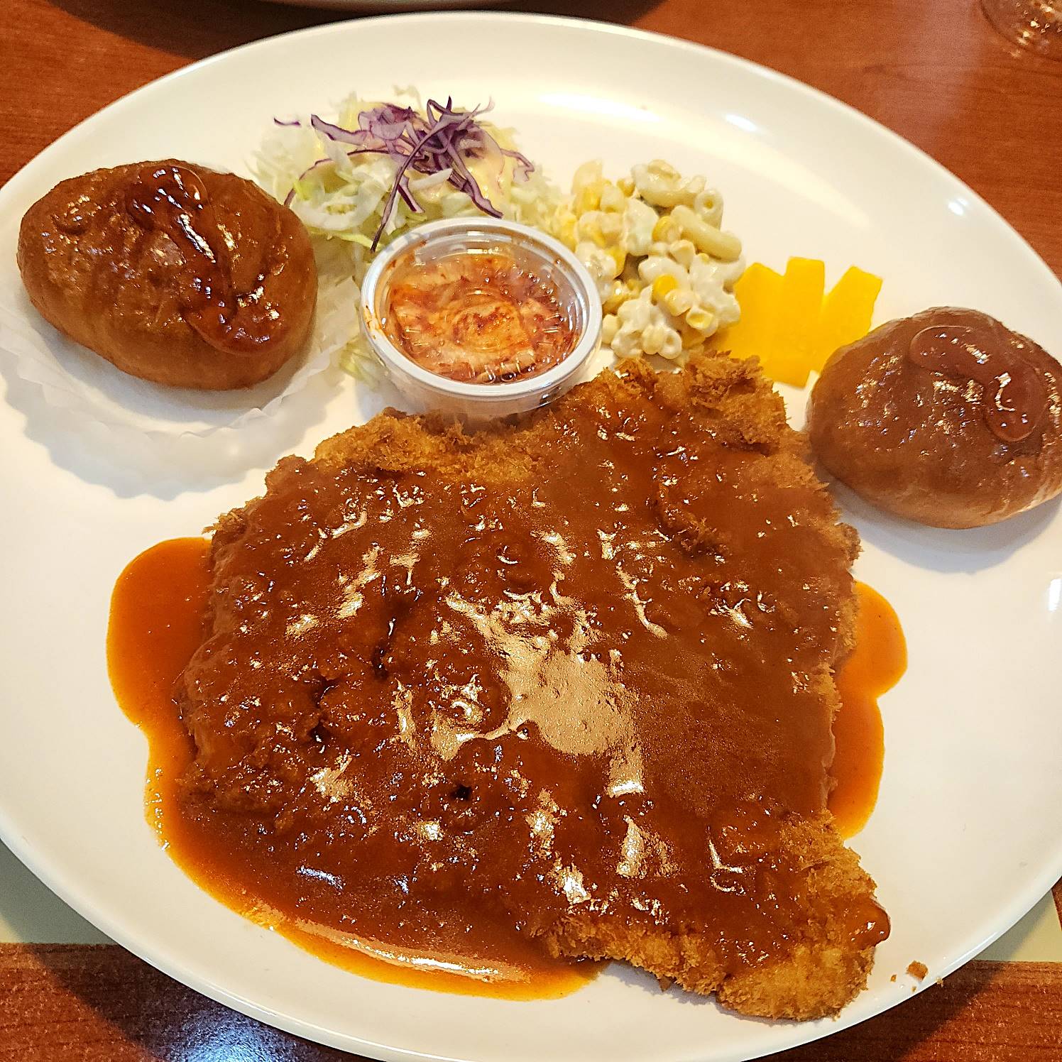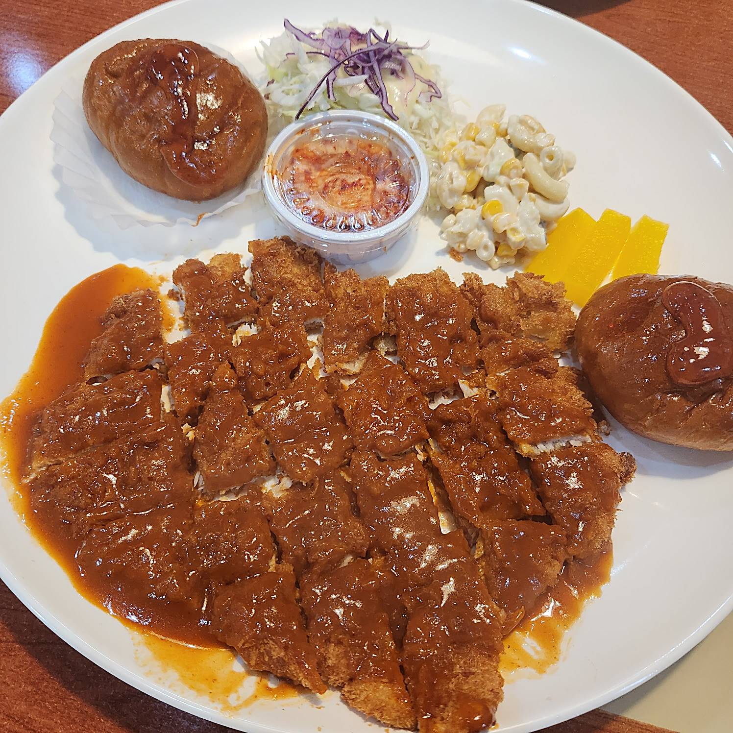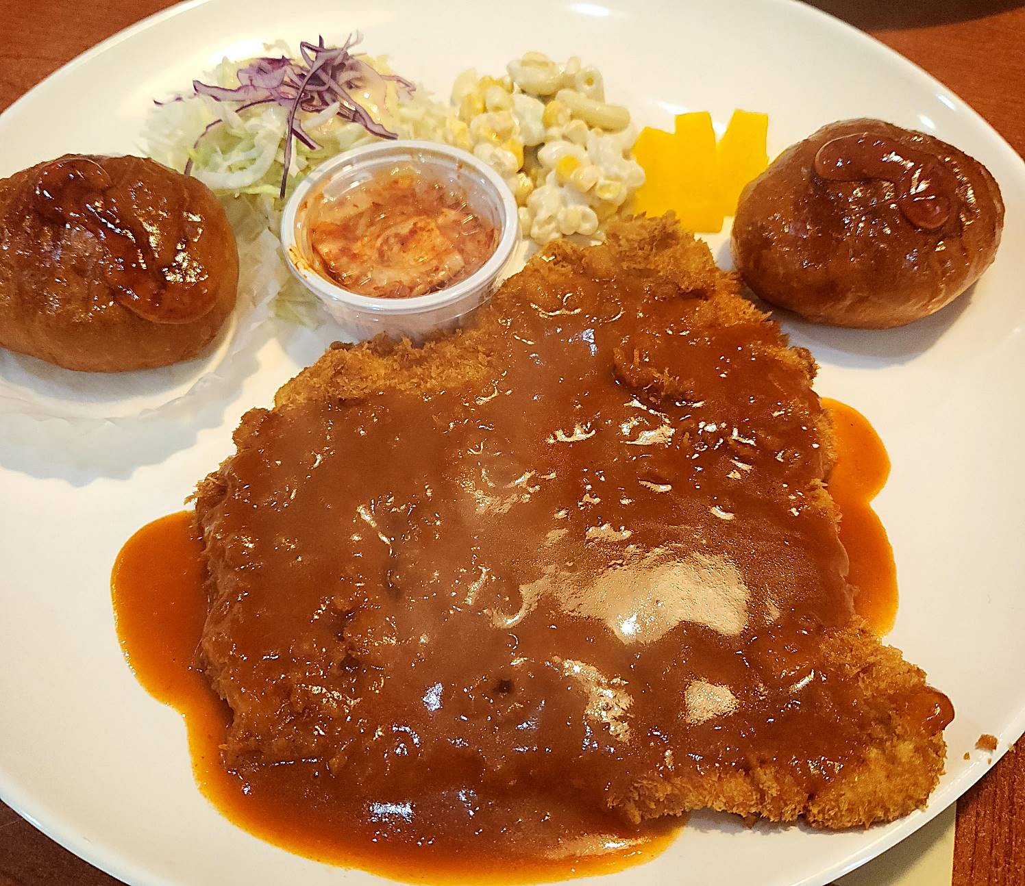 돈까스는 커다란 접시에 하트 한 덩이 ~ 놓여있었고 양 옆에는 빵과 샐러드 김치, 단무지가 있었다. 왜 빵이 두 개냐면!
