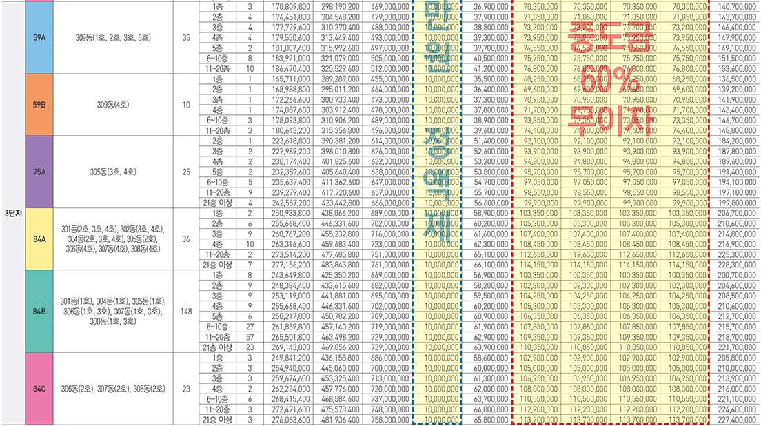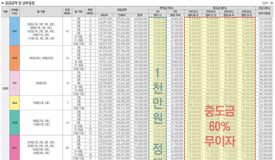 분양가는 국평 84㎡ 3단지 21층 이상기준 7억 6천 1백만원이고 발코니 확장금액 3천만 원까지 더하면 7억 9천1백만 원이 나오면 평당 2천2백8십만 원 정도 되는 분양단지입니다. 계약금은 1차 계약 시에 천만 원 정액제로 어느 정도 부담을 줄여주었고 중도금 60% 무이자로 진행이 되어 옵션제외하면 더 이상의 추가금은 없는 걸로 파악이 됩니다. 같은 날에 모집공고를 냈던 중앙공원 롯데캐슬은 거의 9억 가까이 되는 데... 그거에 비교하면 대략 1억 정도 저렴한 거 같습니다. 84 타입이 8억이라.. 건설경기를 생각하면 높은 분양가는 아니지만 현 부동산 시장에서 중앙공원 롯데캐슬과 더불어 분양이 잘 될는지 의문이 듭니다. 2026년 4월 입주예정이라 대략 2년 정도 예상이 됩니다.