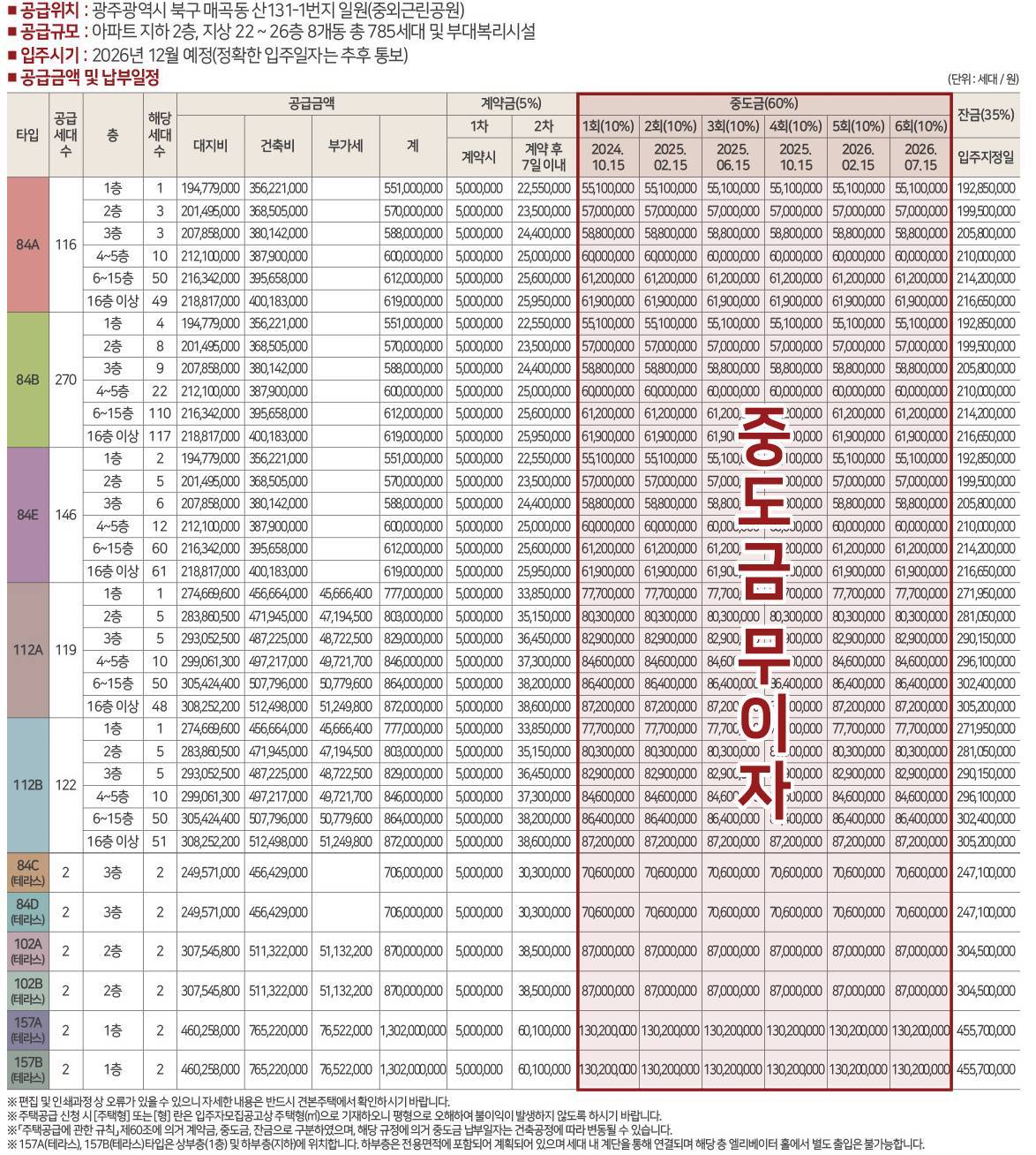 중외공원 힐스테이트분양가는 국평 84㎡ 16층 이상 기준 ₩ 619,000,000원에 발코니 확장비 ₩ 38,500,000원을 더하면 총 ₩ 657,500,000원이 나옵니다. 평당 약 19백340만 원 정도 나오는 분양가를 보여주고 있습니다. 현재 광주 분양가 추이를 보면 합리적인 가격대가 아닌가 라는 생각이 나옵니다. 옆단지에 4월에 분양을 앞두고 있는 운암자이포레나퍼스티체 분양가와 중앙공원 롯데캐슬의 분양가보다는 상대적으로 저렴한 분양가인데 위치적으로 문제였을까..