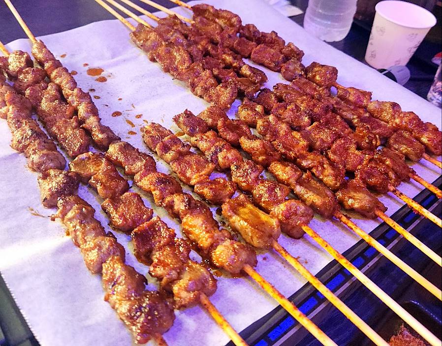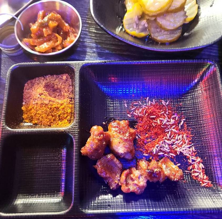 기본 반찬으로는 오이, 당근, 양파피클, 피클, 짜샤이가 나왔고 양꼬치만 나오기를 기다렸다. 양꼬치는 여기서 직접 구워 먹는 게 아니고 숯불에 초벌이 돼서 나오기 때문에 먹기 편했다. 직접 숯불에 구워 먹는 재미가 있는 가게도 있지만 각각의 매력이 있는 듯했다.
