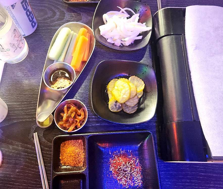 양꼬치 왕눈꽃살 2개와 마늘쫑꼬치, 새우꼬치를 주문했고 다 초벌 되어 나와서 전기불판 위에 따뜻하게 온도유지만 해주고 바로 먹으면 된다!!! 진짜 푸짐한 한상이 차려졌다.