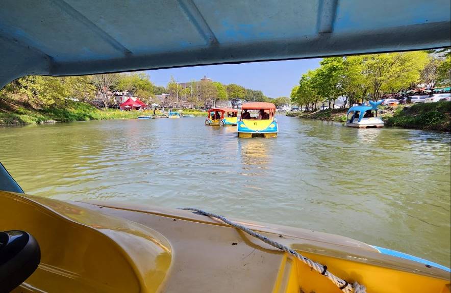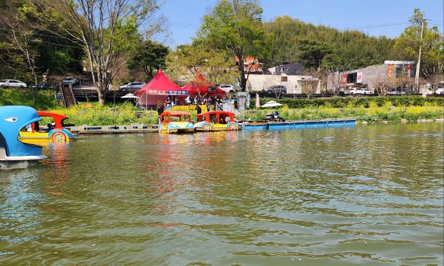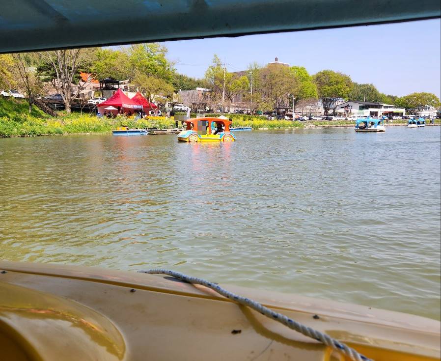 완전히 오리모양의 배는 페달로 굴리는 보트였고 상어모양 자동차 모양 여러 모양의 모터보트가 있어 아이들의 호기심을 자극했고 즐거워했다. 배 안에서 물위에 둥둥 떠다니는 느낌도 좋은 데다 호수 위에 다른 배들의 모습이 보이고 양쪽에는 파릇파릇한 나무들이 봄을 알리고 있는 경치를 보고 있는데 나도 모르게 편안함을 느꼈다.