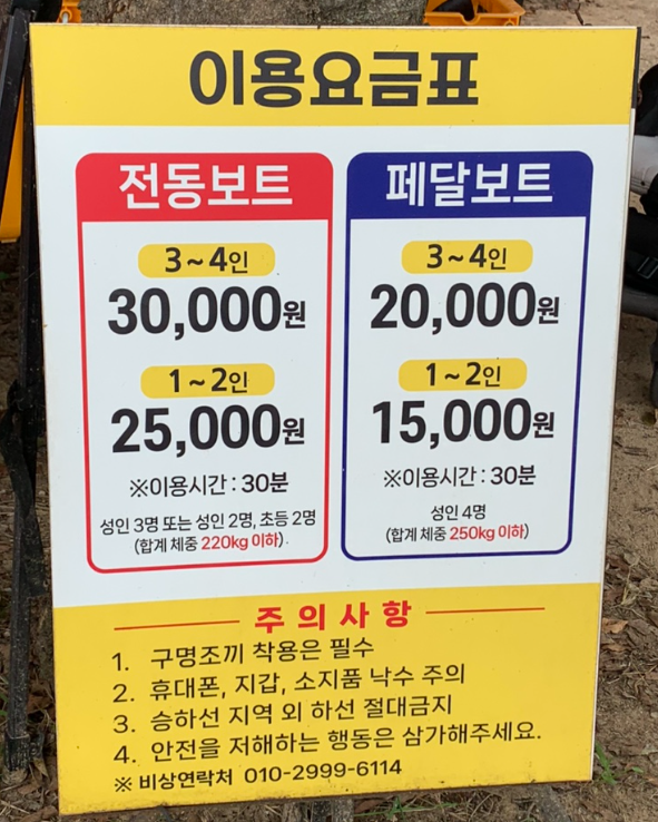 전동보트는 1~2인은 25,000원, 3~4인은 30,000원이였고 (성인 3명 또는 성인 2명, 초등 2명까지 탑승가능)