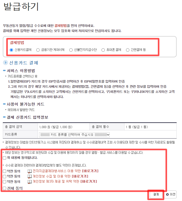 결제 버튼을 누르고 신용카드 결제 외 지불수단을 클릭하고 전체동의를 누른 후에 결제를 진행하면 된다.