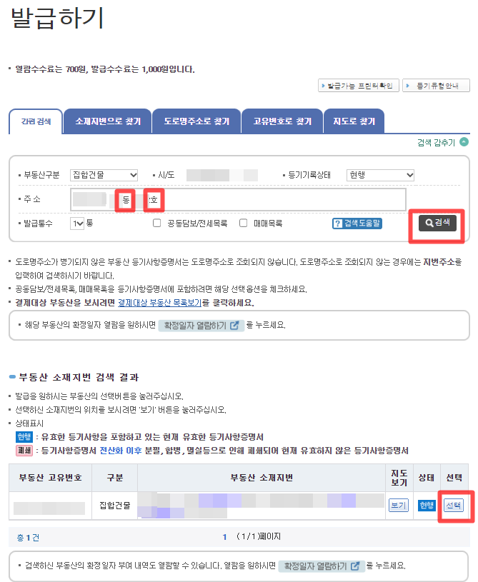 "서면발급하기"를 누르면 아래 화면처럼 간편 검색, 소재지번검색, 도로명주소로 찾기 등 여러 항목이 나오는데 주소를 안다면 간편 검색으로 주소를 입력하면 된다. 부동산 구분은 집합건물(아파트), 토지, 건물이 나오므로 해당하는 곳을 선택해야 하고 아파트를 검색한다고 하면 그 해당 아파트해당 주소만 입력을 하게 되면 그 아파트 동, 호수가 전부 검색이 되기 때문에 찾기가 힘들어져서 꼭 동호수를 입력 후에 검색버튼을 눌러야 한다. 그러면 해당 부동산에서 오른쪽에 선택을 누르면 아래와 같이 소유자가 "홍**"라고 성만 표시된다.