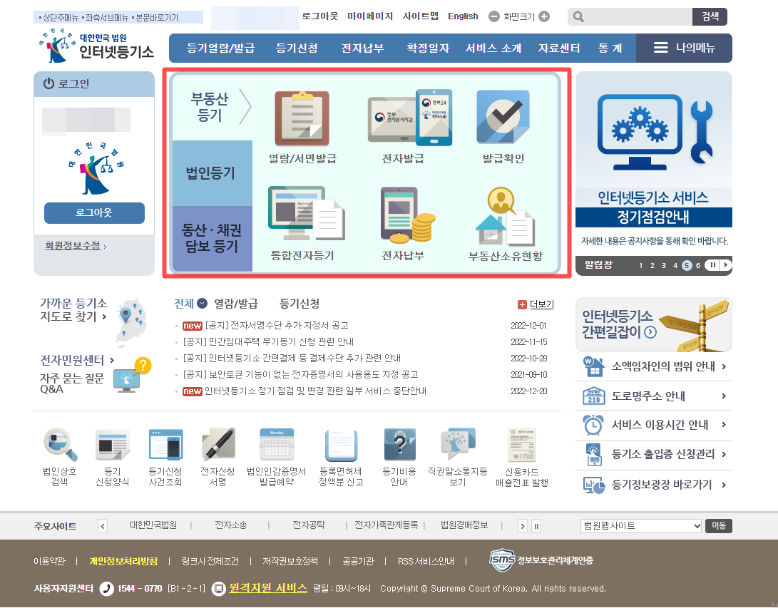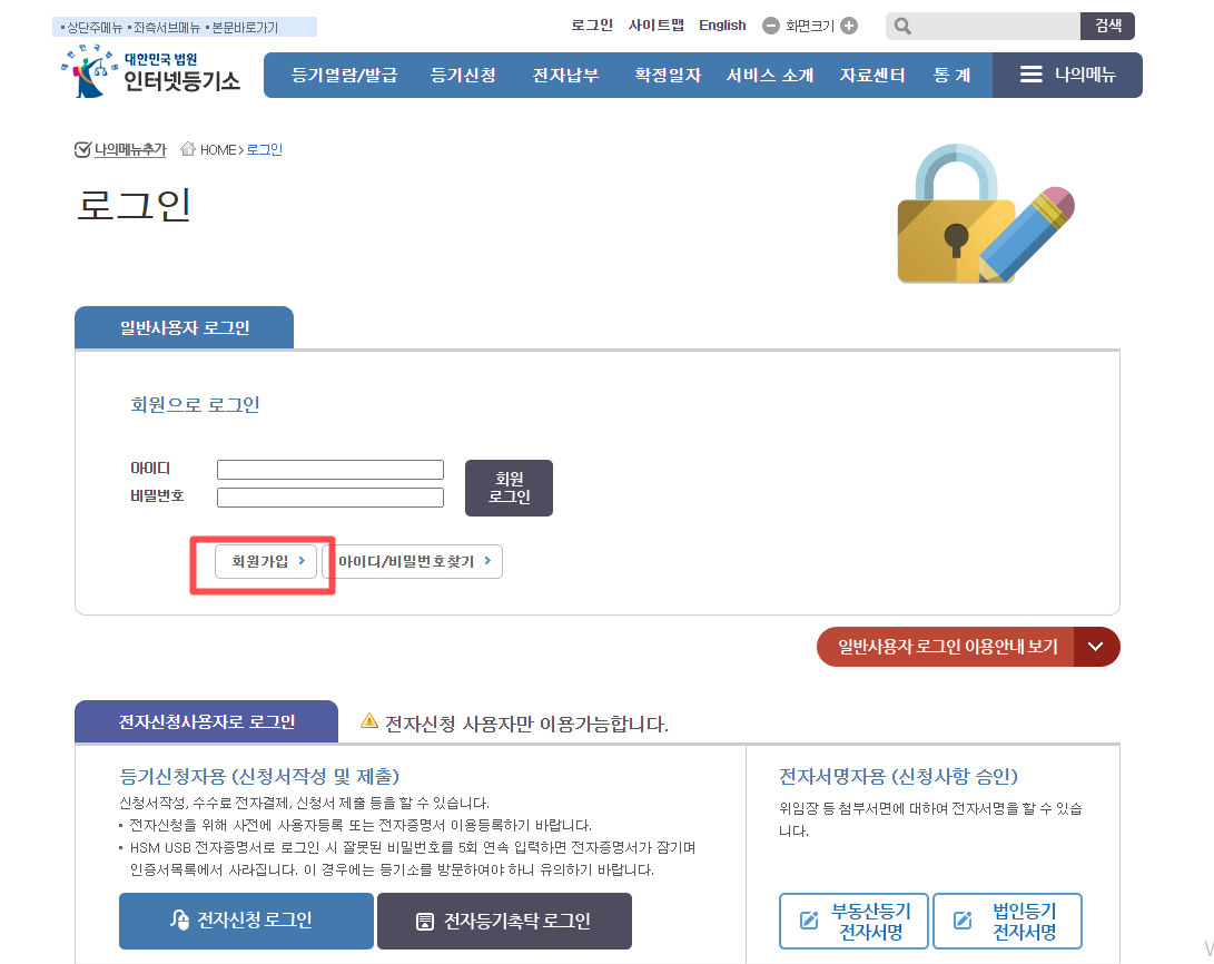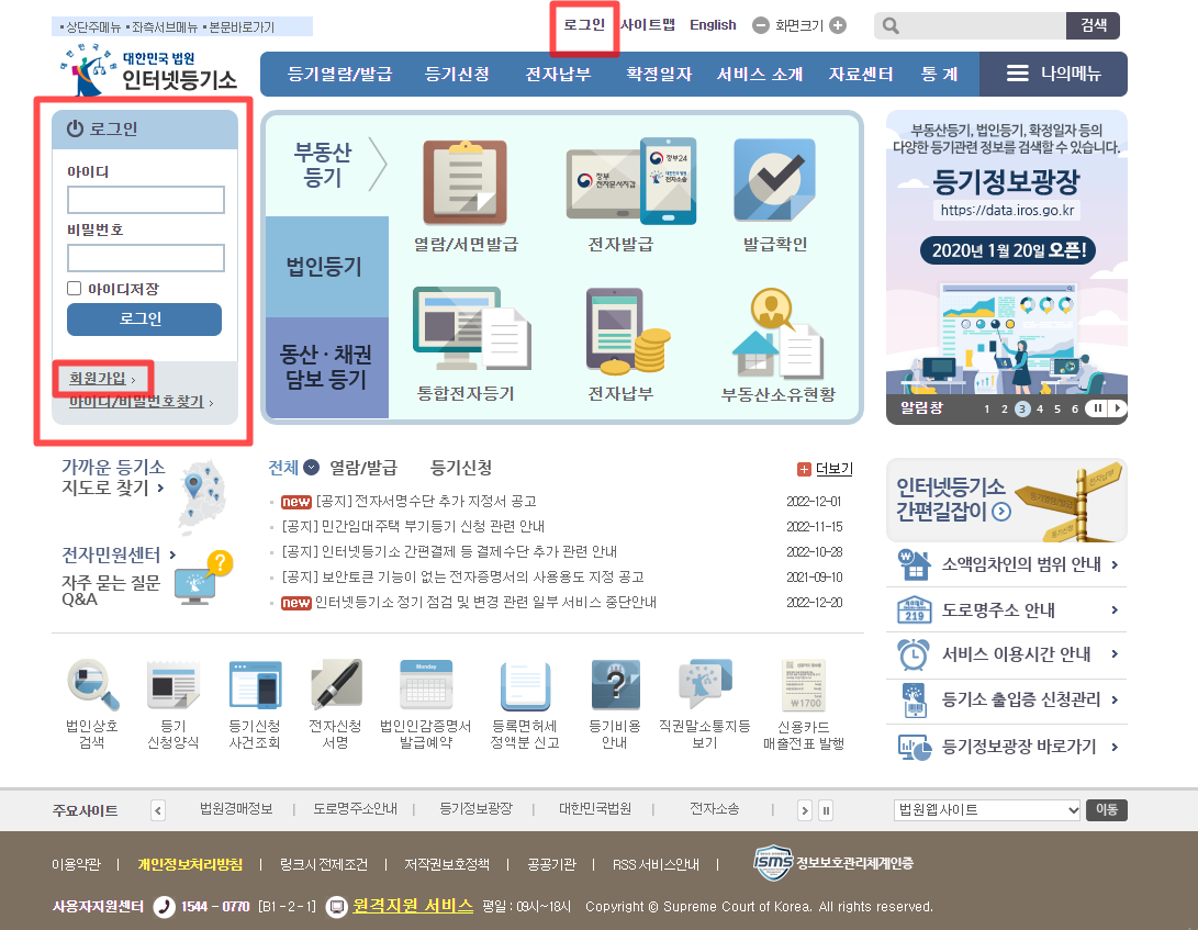 인터넷등기소 메인 페이지를 들어가서 로그인을 해야 한다. 하지만 그전에 회원가입이 선행돼야 하므로 간단한 실명인증으로 회원가입이 가능하니 회원가입 후 로그인을 하길 바란다. 예전에는 비회원발급도 있었으나 요즘에는 보이지가 않아 꼭 회원가입 후에 열람이나 발급받아야 되는 것 같다.