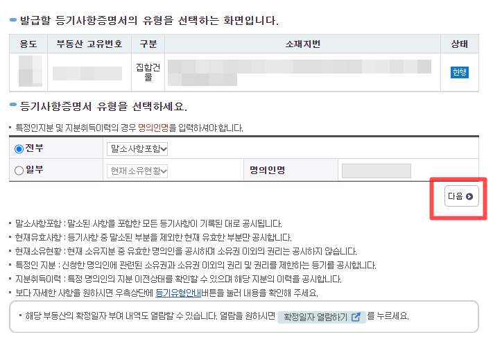 선택을 하였으면 전부, 일부에 말소사항포함으로 출력을 할 것인지 현재유효사항만 출력을 할것인지 나오는데 이왕 등기를 발급을 할 것이면 모든 정보가 포함되는 말소사항 포함 전부를 클릭해서 열람이나, 발급을 하는 게 좋다.