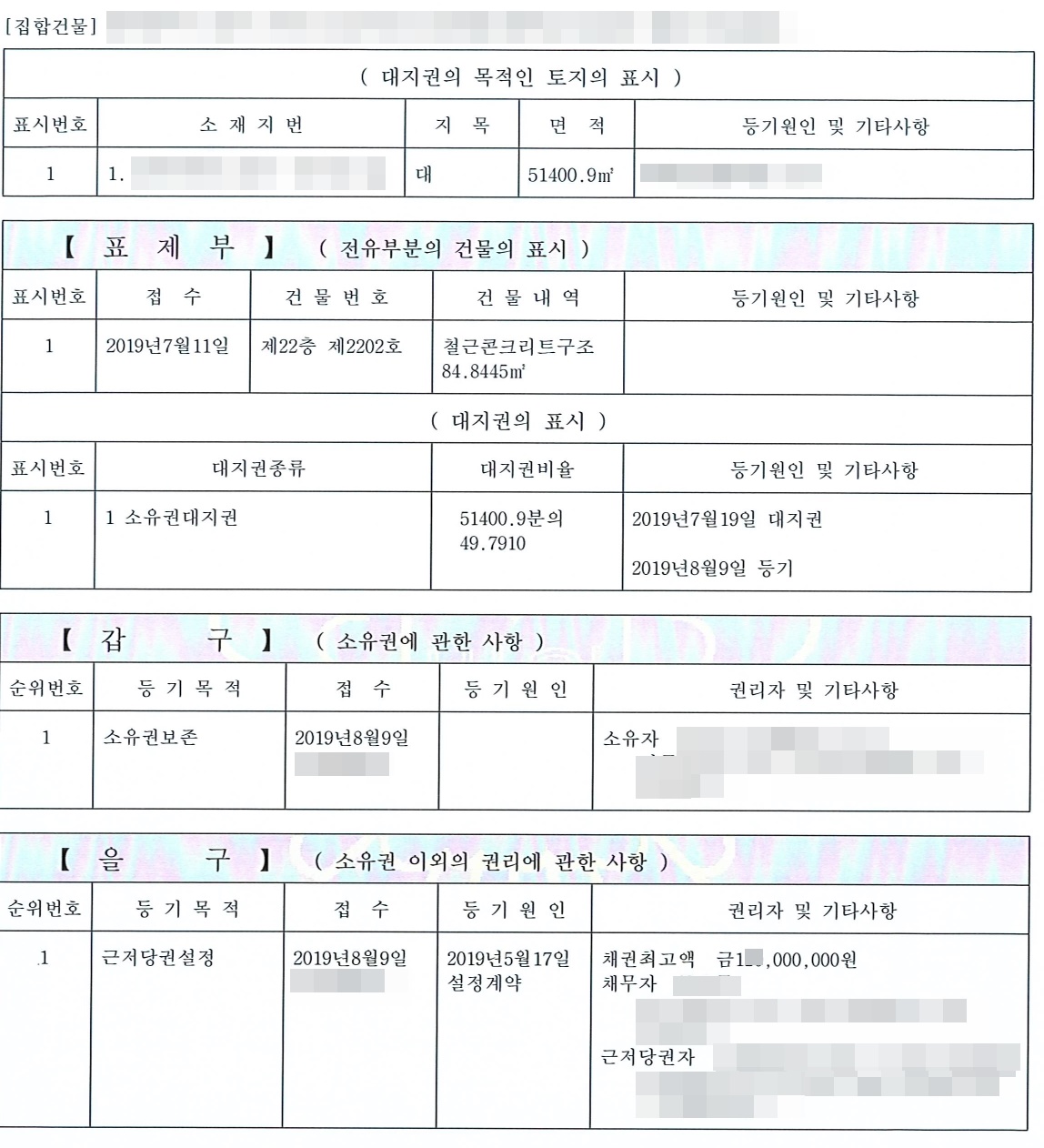 "삼성아파트(표제부) 103동 702호(전유부분 표제부) 소유자 홍길동(갑구), 채권최고액 금 1억(을구)"