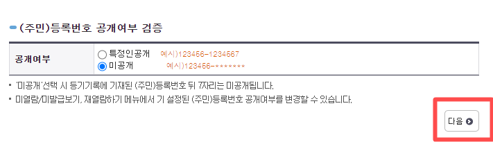 주민등록번호를 알고 있다면 입력을 할 수는 있으나 대부분 모르기 때문에 미공개로 클릭하고 다음을 클릭한다.