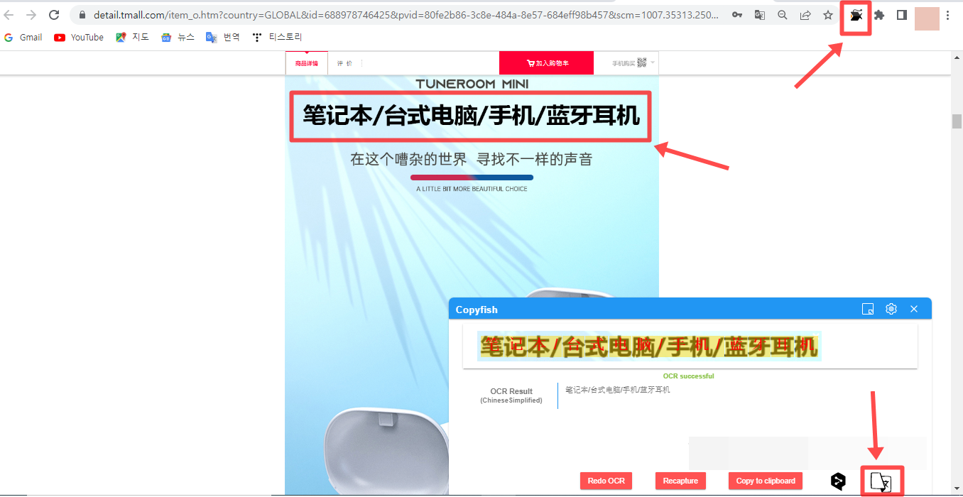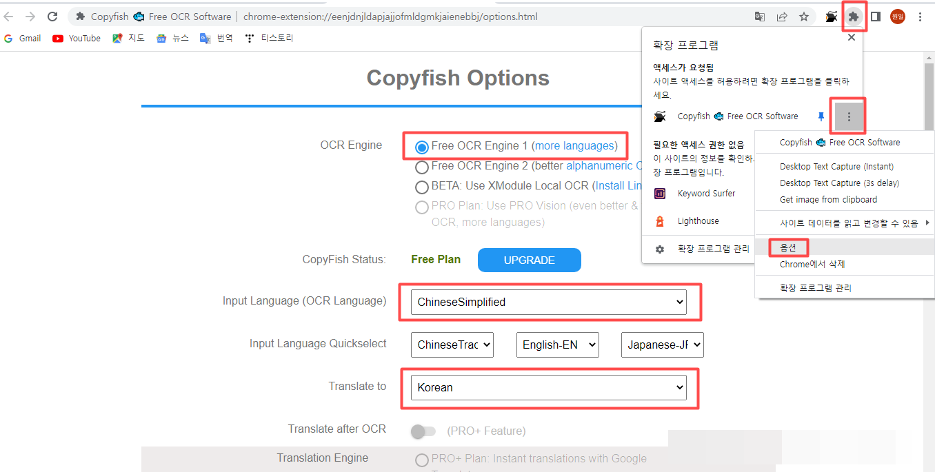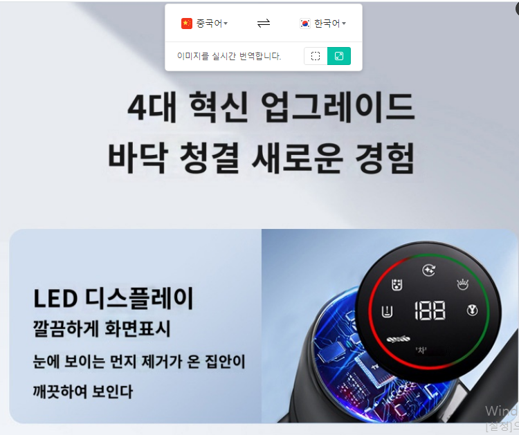 해당 이미지 파일을 번역하려면 주소창 옆에 COPYFISH 아이콘을 클릭하여주고 번역해야 할 곳을 지정해준다. 그러면 아래와 같이 창이 하나 더 뜨면서 인식을 하고 맨 아래에 번역을 눌러주면 자연스럽게 번역이 된다.