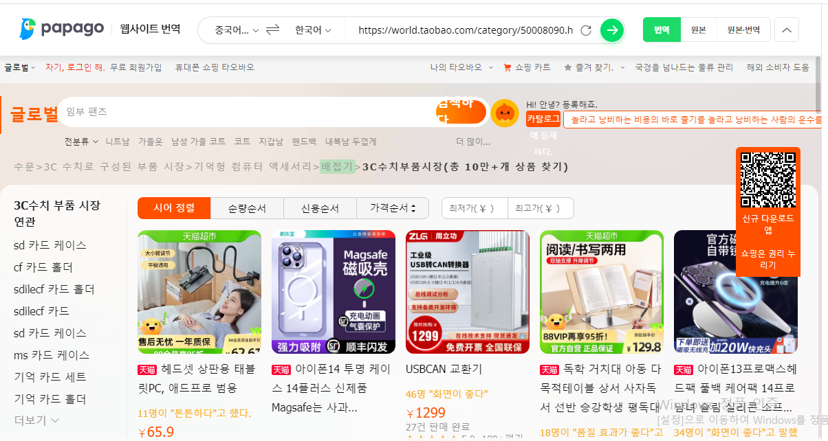 아래 이미지처럼 맨 위에 파파고 웹사이트 번역 주소창이 뜨면서 타오바오에 접속하자마자 바로 해당 웹사이트가 번역이 되는 모습을 볼 수 있다. 그러나 여기에는 타오바오에 판매하고 있는 제품 이미지 번역은 제공되지 않고 있다. 그래서 맨 처음에 언급한 바이두 사이트와 연동해서 써야 된다.