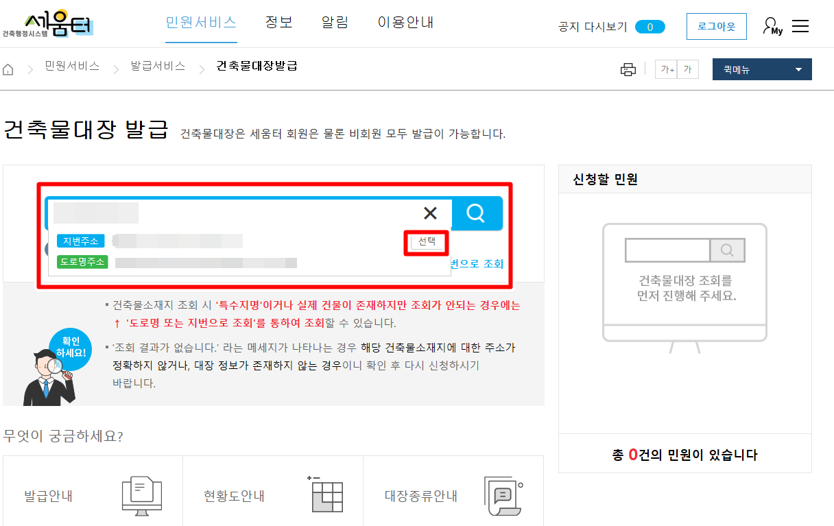 민원서비스-> 발급 서비스-> 건축물대장 발급 메뉴를 클릭하시면 됩니다.