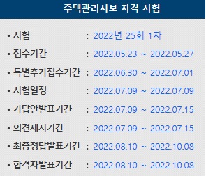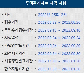 주택관리사 시험 1차 접수기간은 5.23~5.27일까지로 Qnet 홈페이지로 접수하면 되고 합격자 발표 기간은 8월 10일이다. 1차 합격여부를 확인하고 2차 시험은 8.22일부터 8.26일까지이기 때문에 기간 안에 원서접수를 하면 된다. 1년에 시험이 한 번밖에 없기 때문에 기간을 잘 확인하고 원서접수에 차질이 없어야 할 것이다. 그리고 공인중개사시험처럼 1차 2차 나눠서 시험을 볼 수가 있기 때문에 1차 시험을 2022년에 합격하였으면 2023년은 1차 시험은 면제된다.(1회에 한하여)