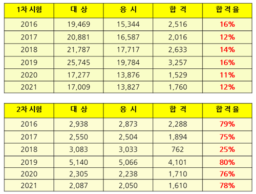 주택관리사 합격률은 극과 극인 것 같다. 1차 시험은 10%대의 합격률을 보이고 있으나 2차 시험은 합격률이 70-80%에 달한다. 1차 시험만 합격한다면 2차 시험은 무난히 합격할 수 있다는 결론이 나온다. 그러나 2018년 시험처럼 25% 합격률은 어떤 분이 출제하셨는지 모르겠지만 이때 시험 본 수험생들은 무척 당황했을 것 같다. 아마 이때 수험생들이 항의를 빗발치게 하지 않았을까 생각이 든다. 공인중개사 시험 15회 때 합격률이 1.48%라는 말이 되지 않은 합격률이 나오면서 시험을 본 수험생들이 강력하게 항의하고 요구하여 15회 추가 시험을 진행했던 경험이 있기에 이 정도 합격률이면 추가 시험을 봐야 하지 않나 조심스럽게 생각해보지만 수험생들은 요구만 할 뿐 실제로 추가 시험은 없었나 보다. 이런 통계를 보다 보면 한 번씩 어떤 시험이든 한 번씩 정말 말도 안 되는 합격률이 나오는 걸 보면 시험도 어느 정도 운이 따라야 한다는 말은 사실인 것 같다.