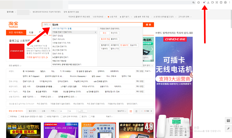 그리고 네이버 번역기나 파파고를 이용하여 검색하고자 하는 키워드를 입력하여 중국어로 번역을 한 후 검색창에 입력하면 된다. 너무 중국어가 많아서 어지러울 수 있다. 이럴 때는 사진에서 처럼 우리나라 국기로 변경해 주시고 보면 한글로 번역이 된다. 저는 전화기를 입력을 하였고 입력을 하니 위에 사진처럼 연관검색어도 한글로 번역되어 알기 쉽게 나와있으니 세부적인 상품 서치가 가능하다. 연관 검색어도 나와있으니 상품 소싱을 할 때 키워드를 선정할 때 유용하게 사용할 수 있다.